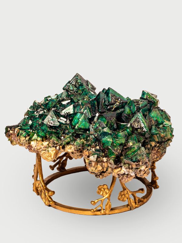 Stunning Malachite table centerpiece showcases the captivating deep green tones and square spiral patterns of malachite, accented with a gentle copper patina that adds a touch of elegance. The intricate hues of vibrant green and earthy shades combine to create a mesmerizing focal point, making it the perfect piece to make a bold statement in any room.
